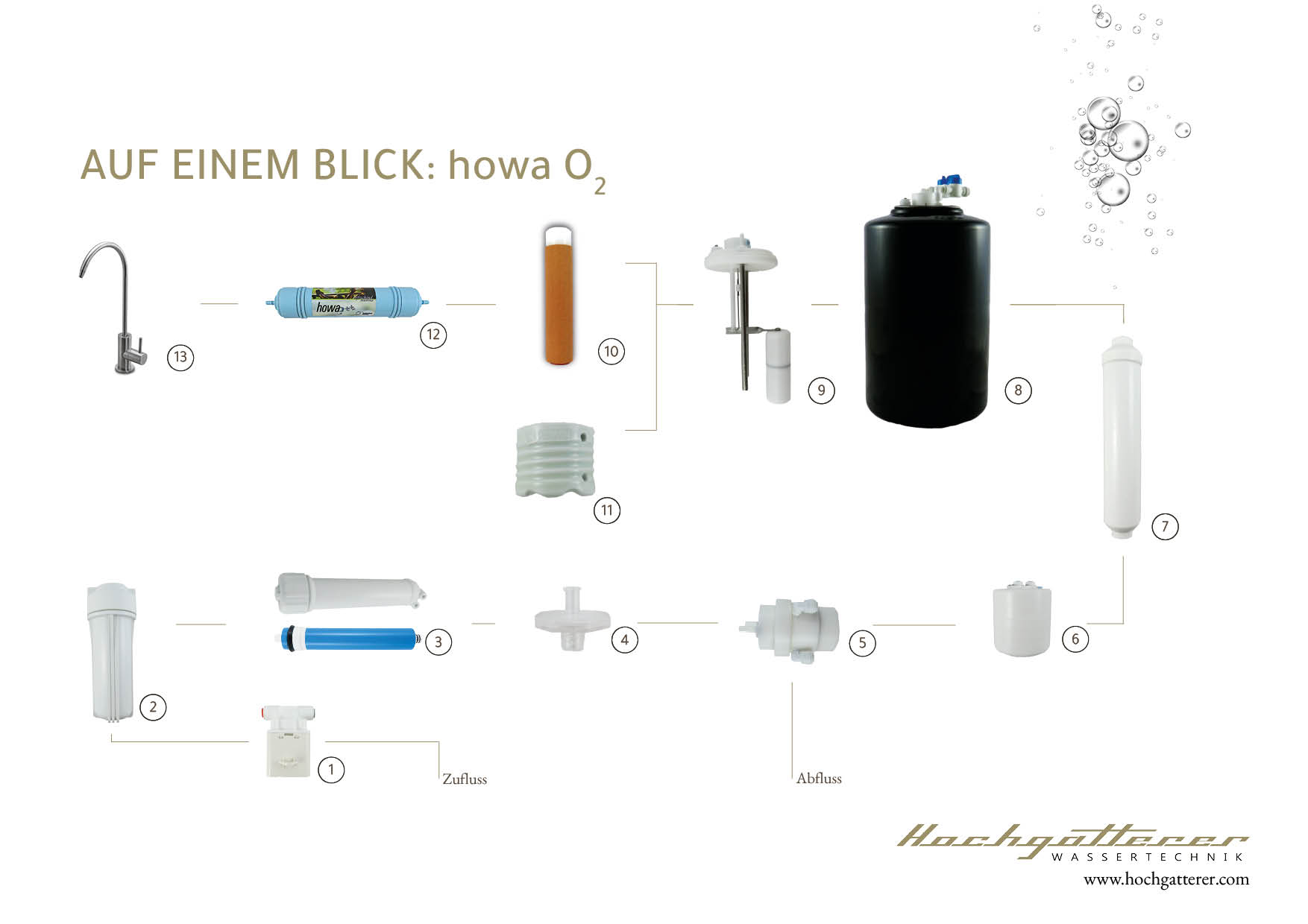 Handgemacht und patentiertUnsere Mitarbeiterinnen und Mitarbeiter sowie die Geschäftsführung und Forschungsabteilung werden täglich vom Streben nach dem Vorbild der Natur angetrieben. Trinkwasser ist das wichtigste Lebensmittel. Die gesündeste Ernährung, das vitalste Leben startet immer mit dem Trinkwasser. Um die Nachteile der Umkehrosmose zu beheben revolutionieren wir unsere howa O2 durch handgefertigte und patentierte Komponenten. Keine Verkeimung durch Luftsauerstoffanreicherung. Über einen medizinalen Luftfilter wird Luftsauerstoff angesaugt. Die patentierte Permeatpumpe verbindet den Luftsauerstoff mit dem gereinigten Wasser aus der Membran. Das Wasser-Luftgemisch wird durch den Aktivkohle-Blockfilter gedrückt um dann in den Tank zu fließen. Dort wird das Gemisch durch einen mikroporösen Naturbraunstein gedrückt, der das Wasser optimal mit dem Luftsauerstoff vermengt. Dadurch wird einer anaeroben Verkeimung vorgebeugt. Zudem werden keine Desinfektionsmittel eingesetzt. Patentierte Komponenten statt Strom. Die patentierte Permeatpumpe wird vom entstandenen Abwasser angetrieben, sodass bei ausreichend vorhandenen Druck (3,4 bar) kein Strom notwendig ist. Handgefertigte Energetisierung. Im Tank befindet sich eine handgetöpferte Biokeramik, die mit den Informationen von Effektiven Mikroorganismen (EM) angereichert ist. Das von unserem Partner Josef Wieser sorgfältig ausgewählte Material wird vor der Verarbeitung mindestens ein Jahr lang gelagert. Die EM-Keramik unterstützt regenerative und verhindern fäulnisbildende Prozesse. Mehr zum Thema Energetisierung. Wartungsintervall angepasst auf Wasserqualität. Wir achten generell auf hochwertige Komponenten, bei den eingesetzten Filtern schlägt sich die Qualität in den Wartungsintervallen nieder. Je nach Wasserausgangsqualität sind einjährige Intervalle oder alle zwei Jahre Filterwechsel möglich. Unsere Aufbereitungsanlagen stehen vor Auslieferung auf unserem Prüfstand. Die Installation und der Filterwechsel werden von unseren hauseigenen Monteuren durchgeführt. Unsere Kundinnen und Kunden werden bequem vor einem bevorstehenden Filterwechsel von unserem Team informiert. Hoher Wasserverbrauch ade. Auch hier wirkt unsere patentierte Permeatpumpe, aber auch der speziell handemaillierte Tank. In herkömmlichen Umkehrosmoseanlagen wird im Tank eine Gummimembran eingesetzt, die das Wasser durch Gegendruck zum Wasserhahn befördert. Aufgrund des steigenden Gegendruckes im Tank wird ebenfalls mehr Abwasser produziert. Anstatt dessen nutzen wir einen Tank, der innen und außen zweimal von Hand emailliert wird. Die patentierte Permeatpumpe gleicht enstehenden Gegendruck aus. Das sorgt für ein gleichbleibendes Abwasserverhältnis.