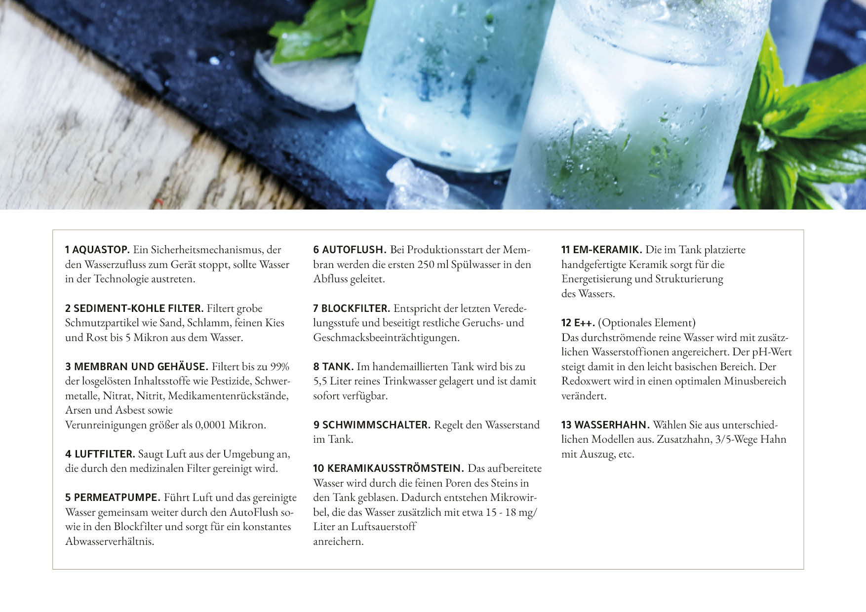 Die Revolution der UmkehrosmoseDie Umkehrosmose (auch Molekularfiltration) ist die optimale Möglichkeit, die im Wasser gelösten Stoffe herauszufiltern. Dabei wird das Wasser mit Druck durch eine halbdurchlässige Membran gedrückt und so bis zu 99 Prozent der Schadstoffe herausgefiltert. Dieses Verfahren hat aber auch Nachteile:
